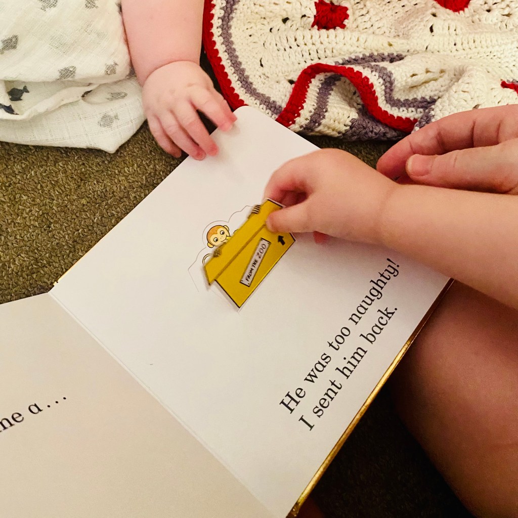 That brings us to S. I am sure that her experience of books is much more interrupted than it was for either of the older girls. “Here is the blue sheep, and here is the WHAT WAS THAT? What was that sound? Ok put that down… And here is the red sheep. Here is the bath sheep E, stop, get down from there, thank you, and here is the bed sheep. But where is no, I said NO, hands off! Gentle… gentle… no sweetie she needs to breathe. Thank you, maybe we can play with it next? But not shoved into her face like that…” etc. That said, this week has been especially lovely. E is past the stage where she pulls so enthusiastically (or intentionally) that any flaps from lift-the-flap books are ripped off. S is in the stage of knowing that this bit of coloured cardboard moves and there’s another picture behind it and ooh look! It’s an elephant! So I have been able to read Dear Zoo (Rod Campbell) to both of them, together, delightfully. This coming week we will also revive some of our other flappy books and I may even get inspired to fix the no-longer-very-flappy books.