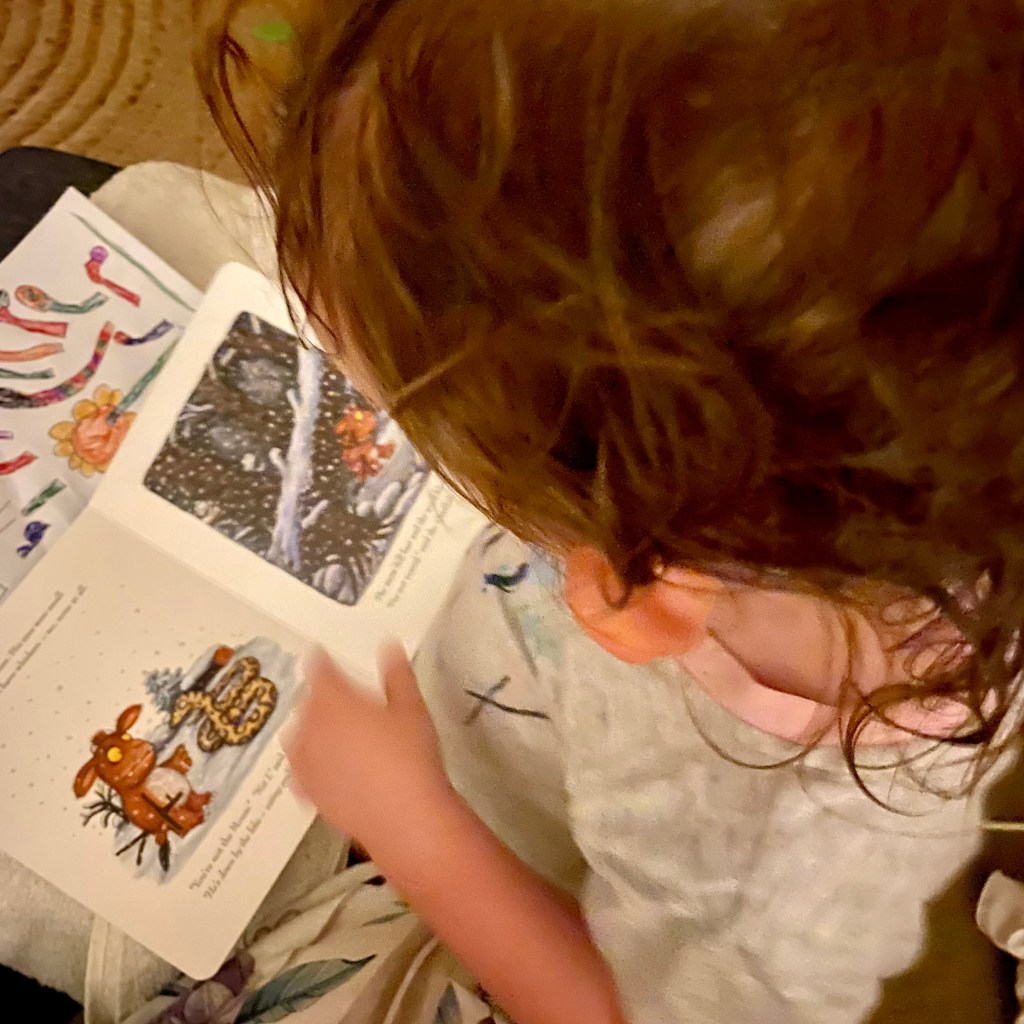 Tonight after the big girls had finished their bath, E went to the bookshelf and pulled out her current favourite book, a board version of The Gruffalo’s Child, and started reading it. I haven’t read it to her very much. In fact, I don’t think I’ve managed to read it entirely yet as she keeps turning pages for me and getting to the same page and saying the same phrase, over and over, looking very worried, and I don’t know what she is saying but this is clearly very important. I didn’t read it to her tonight though, because C found the Frozen book after months (MONTHS!), months of searching and all was well with the world. She sat on my lap and I started reading it, then E came over and snuggled in and I had my two big girls cuddled around me as I read to them and my heart melted.