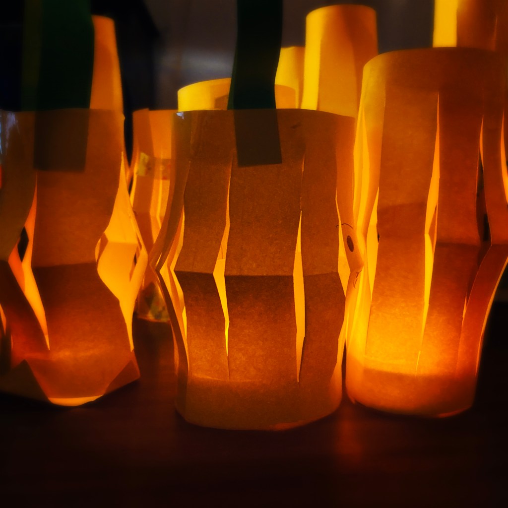 After baths, and when S was asleep already, I showed E and C how to make paper strip lanterns and we made a line of them up the hallway. Halloween craft done, plus it meant we had lovely flickering LED tea lights making the place cosy.